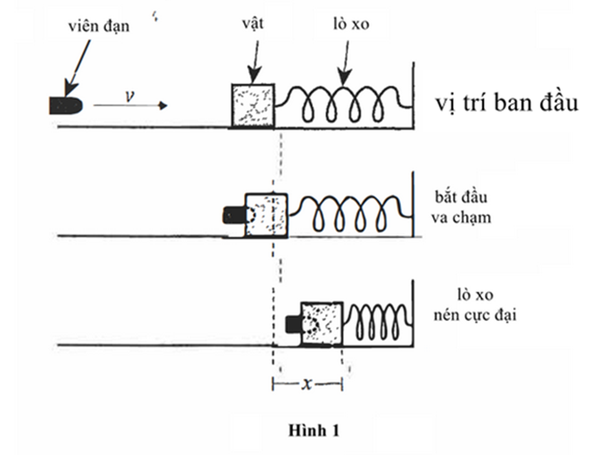 Trong mỗi thử nghiệm, điều sau đây đã xảy ra: Đầu tiên, một lò xo có hằng số lò xo k (thước đo độ cứng của lò xo) được gắn vào một khối có khối lượng \({M_B}\). Tiếp theo, khối được đặt trên một mặt nằm ngang không ma sát sao cho lò xo không bị kéo dãn cũng như không bị nén lại. Sau đó, một viên đạn có khối lượng \({m_p}\) được phóng về phía vật với vận tốc v. Khi va chạm, viên đạn bị mắc kẹt trong khối. Lực va chạm đã nén lò xo một đoạn x lớn nhất. Hình 1 minh họa quá trình va chạm trên: