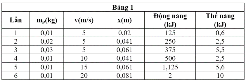 Xét các viên đạn có khối lượng khác nhau bay với vận tốc ban đầu khác nhau. Khối lượng vật nặng được gắn với lò xo là 2kg và độ cứng của lò xo là 3N/m. Giá trị của x và năng lượng của chuyển động được cho trong bảng 1: