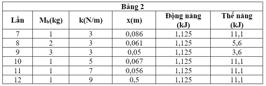 Thực hiện tương tự nhưng khối lượng và vận tốc của viên đạn giữ nguyên là 0,01kg và 15m/s, thay đổi khối lượng vật nặng và độ cứng của lò xo.