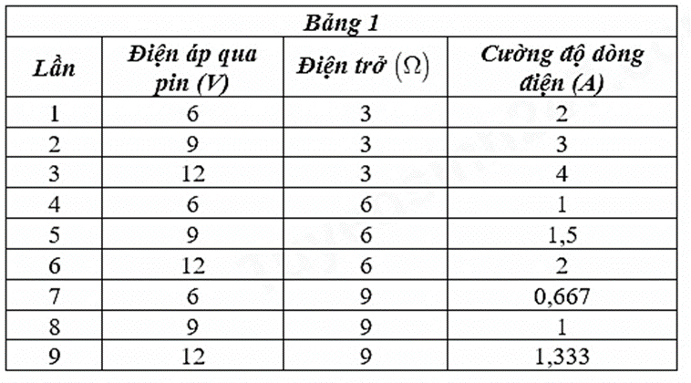 Học sinh được cung cấp nhiều loại pin, điện trở và ampe kế , cùng với dây điện và đầu nối. Học sinh xây dựng mạch điện dựa trên sơ đồ mạch điện bên dưới và đo cường độ dòng điện trong mỗi mạch. Bảng 1 cho thấy kết quả của họ.