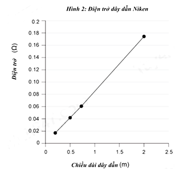 Để nghiên cứu sâu hơn về tính chất của điện trở, học sinh đã thay thế điện trở trong mạch của mình bằng các cuộn dây niken có độ dài khác nhau. Học sinh dùng một nguồn điện biến đổi để điều chỉnh hiệu điện thế cho đến khi cường độ dòng điện bằng 1 A. Sau đó, sau đó sử dụng mối liên hệ giữa hiệu điện thế, cường độ dòng điện và điện trở đã xác định ở Thí nghiệm 1 để tính điện trở của cuộn dây. Kết quả của họ được biểu thị trong Hình 2.