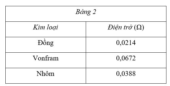 Học sinh lặp lại quy trình từ Thí nghiệm 2 bằng cách sử dụng cuộn dây dài 1 mét bằng nhiều loại kim loại khác. Kết quả của họ được đưa ra trong Bảng 2.