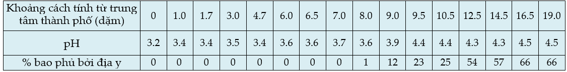 Bảng dưới đây ghi lại kết quả của một nghiên cứu môi trường, thể hiện độ pH của vỏ cây tần bì (Fraxinus chinensis) và tỷ lệ phần trăm (%) bao phủ của một loại địa y. Dữ liệu được thu thập dọc theo một đường dài 19 dặm, bắt đầu từ trung tâm của một thành phố công nghiệp lớn về hướng ngoại thành là vùng nông thôn.