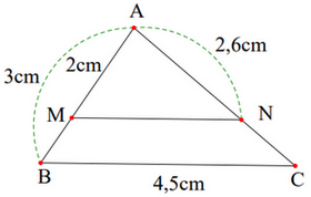 Quan sát hình. Biết \(MN//BC;AB = 3\;cm;AM = 2\;cm;AN = 2,6\;cm;BC = 4,5\,cm\). Độ dài đoạn thẳng NC