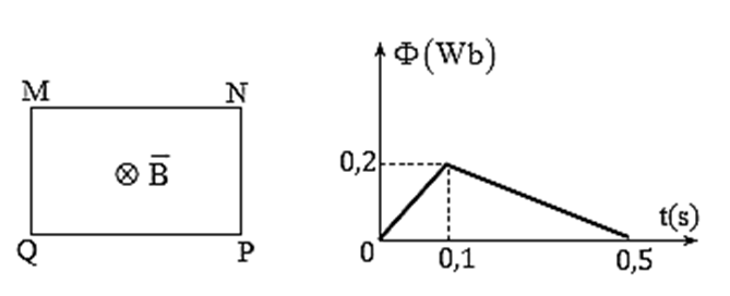 Một khung dây dẫn phẳng hình chữ nhật MNPQ gồm 1000 vòng dây được đặt trong từ trường đều sao cho vectơ cảm ứng từ vuông góc với mặt phẳng khung. Từ thông qua một vòng dây biến đổi theo thời gian như hình. Điện trở của một vòng dây là \(0,05\Omega \).
