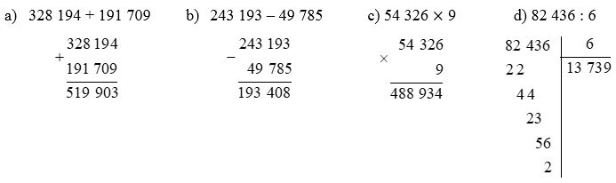 Đặt tính rồi tính: a) 328 194 + 191 709 b) 243 193 – 49 785
