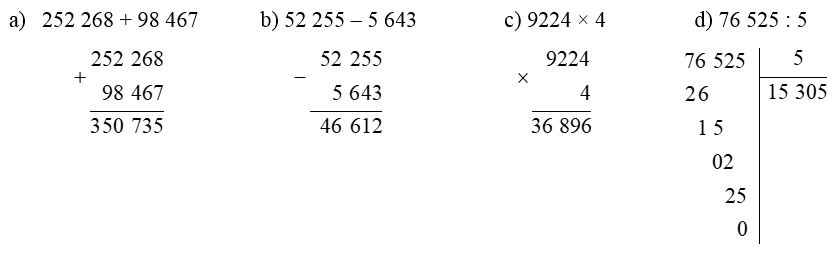 Đặt tính rồi tính: a) 252 268 + 98 467 b) 52 255 – 5 643