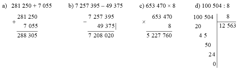 Đặt tính rồi tính: a) 281 250 + 7 055 b) 7 257 395 – 49 375