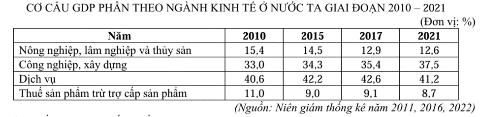 Cho bảng số liệu sau: Tỉ trọng khu vực dịch vụ trong cơ cấu GDP nước ta năm 2021 cao hơn