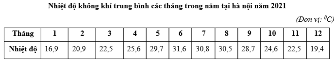 Căn cứ vào bảng số liệu trên, cho biết nhiệt độ trung bình năm tại Hà Nội năm 2021 (làm tròn kết quả đến một chữ số thập phân).