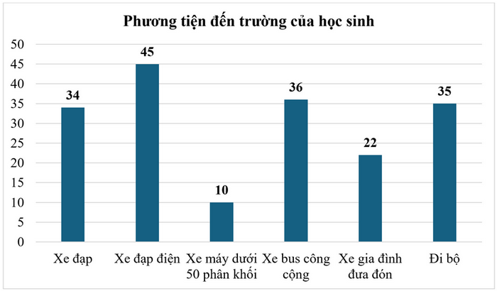 Trong bài tuyên truyền về an toàn giao thông, để có dữ liệu chia sẻ với các bạn, Lan đã thực hiện khảo sát loại phương tiện mà các học sinh sử dụng để đến trường. Lan đã lập biểu đồ thể hiện số liệu của mình dưới đây.