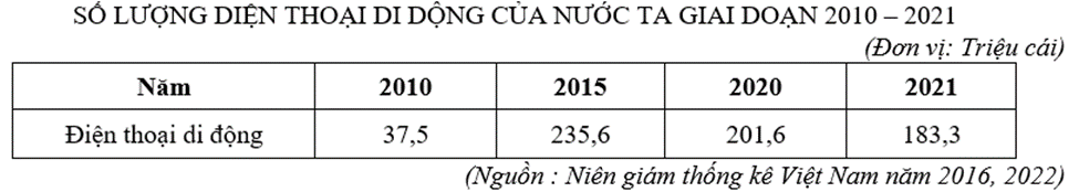 Căn cứ vào bảng số liệu trên, tính tốc độ tăng trưởng số lượng điện thoại di động của Việt Nam năm 2021 so với năm 2010 (coi năm 2010 = 100%) (Làm tròn kết quả đến hàng đơn vị của %).