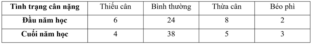 Vào đầu năm học, người ta lựa chọn ngẫu nhiên một số học sinh lớp 8 để kiểm tra tình trạng cân nặng. Kết quả khảo sát được ghi lại ở bảng sau:
