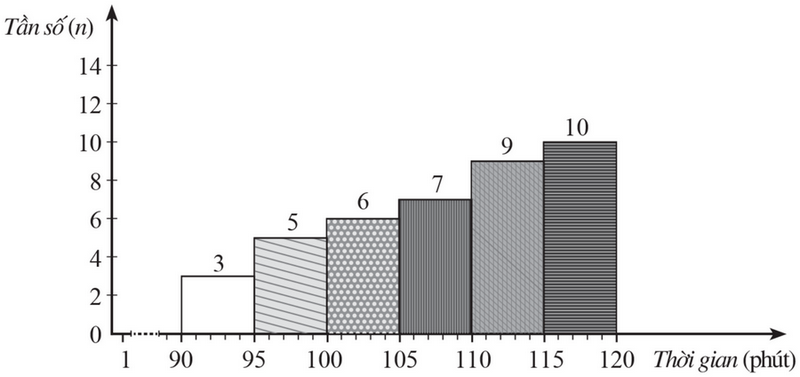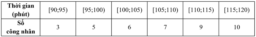 Một đội công nhân tham gia hội thi tay nghề giỏi. Mỗi công nhân phải hoàn thành bài thi (lí thuyết và thực hành) trong thời gian 120 phút. Thời gian hoàn thành bài thi của các công nhân trong đội đó được cho ở bảng sau: