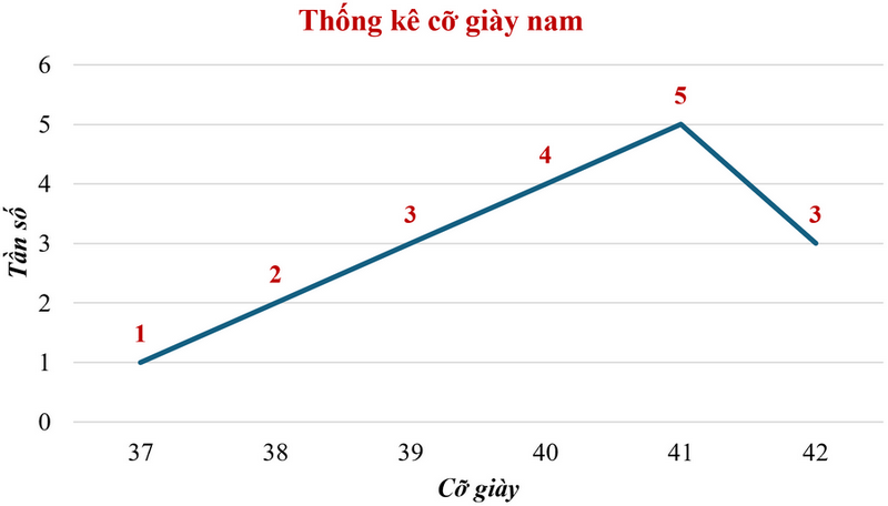 b) Hãy vẽ biểu đồ tần số dạng cột và dạng đoạn thẳng của bảng tần số dữ liệu về cỡ giày nam trong bảng trên. Theo em, biểu đồ dạng nào thể hiện dữ liệu phù hợp hơn? Tại sao?