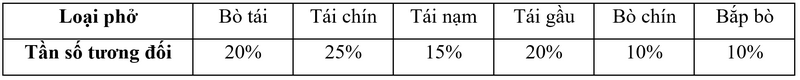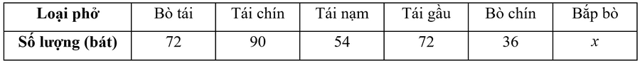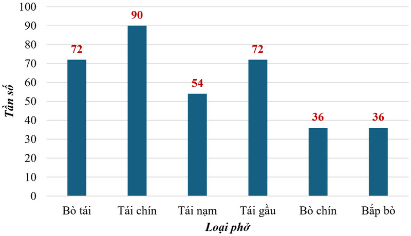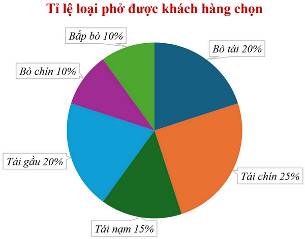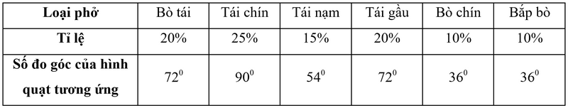 Chú Đàm Văn Cường là chủ một tiệm phở bò nổi tiếng ở Hà Nội. Để chuẩn bị nguyên liệu phù hợp hơn, chú Cường đã thống kê loại phở của 360 bát phở được khách hàng chọn ăn ở tiệm của mình trong tuần trước. Kết quả thống kê được ghi lại như sau: