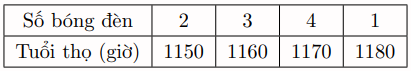 Khi nghiên cứu tuổi thọ của một loại bóng đèn, người ta đã chọn tùy ý 10 bóng đèn trong một lô hàng và bật sáng liên tục cho đến khi nó tự tắt. Tuổi thọ của các bóng đèn (tính theo giờ) của các bóng đèn được ghi lại trong bảng sau: