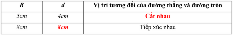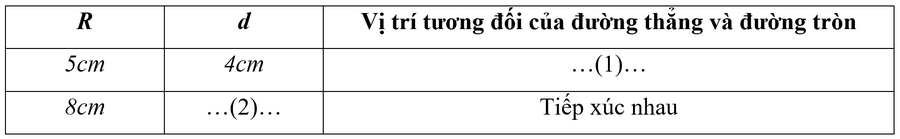 Điền vào các vị trí (1); (2) trong bảng sau (R là bán kính của đường tròn, d là khoảng cách từ tâm đến đường thẳng).