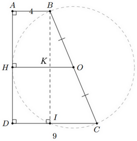 Cho hình thang vuông \(ABCD\,\,(\angle A = \angle D = {90^0}),AB = 4\;cm,BC = 13\;cm\) và \(CD = 9\;cm\). Tính \(AD\) và chứng minh rằng đường thẳng \(AD\) tiếp xúc với đường tròn có đường kính là \(BC\).