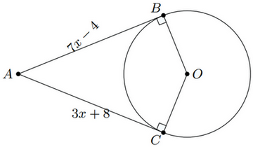 Quan sát hình bên. Biết \(AB,AC\) lần lượt là tiếp tuyến của đường tròn \(\left( O \right)\) tại \(B,C.\) Tính giá trị của \(x\).