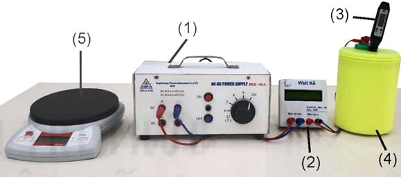 Tiến hành đo nhiệt dung riêng của nước với các dụng cụ sau: Biến thế nguồn (1), bộ đo công suất nguồn nhiệt (2), nhiệt kế điện tử hoặc cảm biến nhiệt độ (3), nhiệt lượng kế (4), cân điện tử (5), các dây nối…