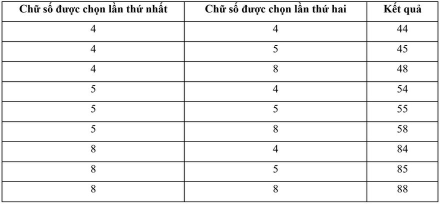 Trong một trò chơi, Hà đưa ra ba chữ số là 4,5,8 và cho Minh chọn ngẫu nhiên hai số trong ba số đã cho (có thể chọn một số hai lần) để tạo thành một số có hai chữ số, chữ số chọn trước là chữ số hàng chục, chữ số chọn sau là chữ số hàng đơn vị.