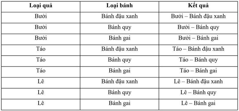 Ở nhà có các loại quả là bưởi, táo, lê và các loại bánh là bánh đậu xanh, bánh quy và bánh gai. Mẹ bảo Kem chọn một loại quả và một loại bánh để mang đi biếu ông bà ngoại. Kem chọn mẫu nhiên một loại quả và một loại bánh.