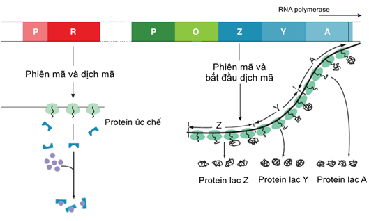 Khi có mặt lactose trong môi trường, các phân tử lactose sẽ liên kết với protein ức chế, làm biến đổi cấu trúc không gian của protein ức chế, làm cho protein ức chế không bám được vào vùng vận hành. Vì vậy, RNA polymerase liên kết với vùng khởi động để tiến hành phiên mã tạo ra các phân tử mRNA của các gene cấu trúc Z, Y, A, và dịch mã để trở thành các enzyme phân giải đường lactose.