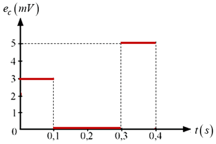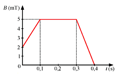 Một khung dây dẫn kín, phẳng có diện tích \(10c{m^2}\), gồm 100 vòng dây, đặt trong từ trường có vecto cảm ứng từ vuông góc với mặt phẳng khung dây. Độ lớn cảm ứng từ biến thiên theo thời gian như đồ thị trong Hình vẽ.