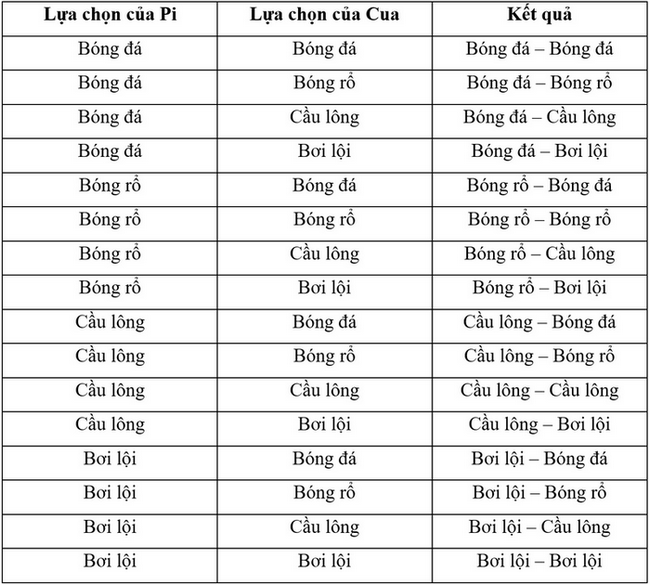 Trong chương trình học tập Câu lạc bộ ngoài giờ, mỗi bạn trong lớp được chọn một môn thể thao bao gồm bóng đá, bóng rổ, cầu lông và bơi lội. Hai bạn Pi và Cua lớp 2A2 lần lượt đăng kí môn học của mình. Tính xác suất của biến cố A: “Hai bạn cùng đăng kí một môn thể thao”.