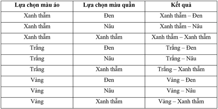 Trong tủ quần áo còn có 3 chiếc áo màu xanh thẫm, màu trắng hoặc màu vàng cùng với 3 chiếc quần màu xanh thẫm, màu đen hoặc màu nâu, Hùng đã chọn ngẫu nhiên 1 chiếc áo và 1 chiếc quần. Tính xác suất Hùng chọn được áo và quần không cùng màu.