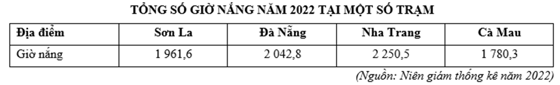 Căn cứ vào bảng số liệu trên, hãy cho biết tổng số giờ nắng của Nha Trang gấp mấy lần tổng số giờ nắng của Sơn La (làm tròn kết quả đến hai chữ số thập phân).