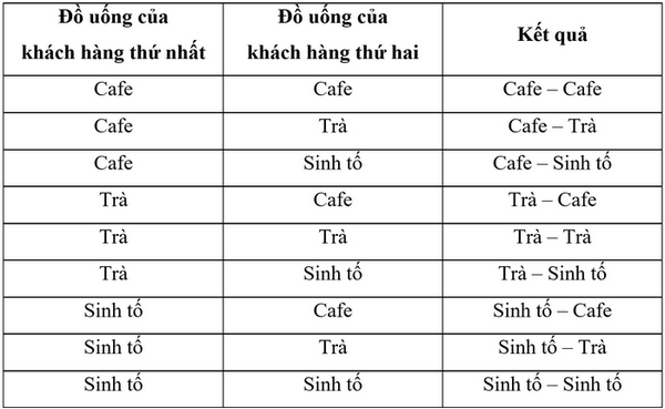 Quán café nhà Mai có các đồ uống là café, trà và sinh tố. Có hai khách hàng vào quán café và lần lượt gọi đồ uống. Tính xác suất của các biến cố sau: