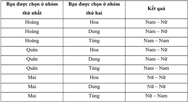 Nhóm 1 có các bạn Hoàng (nam), Quân (nam) và Mai (nữ). Nhóm 2 có các bạn Hoa (nữ), Dung (nữ), Tùng (nam). Cô giáo chọn ngẫu nhiên 1 bạn ở nhóm 1 và 1 bạn ở nhóm 2. Tính xác suất của các biến cố: