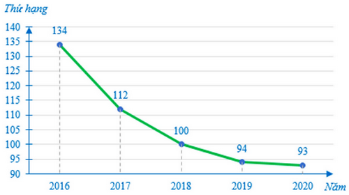 Biểu đồ dưới đây cho biết thứ hạng của bóng đá nam Việt Nam trên bảng xếp hạng của Liên đoàn Bóng đá thế giới (FIFA) trong các năm từ 2016 đến 2020.