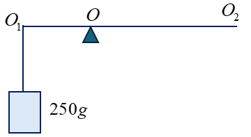 Cho hệ thống đòn bẩy như hình vẽ. Để đòn bẩy cân bằng, ta phải treo một vật m = 100 g ở vị trí \({{\rm{O}}_2}\) cách O một đoạn... Biết rằng \({{\rm{O}}_1}\) cách O môt đoạn 20 cm.