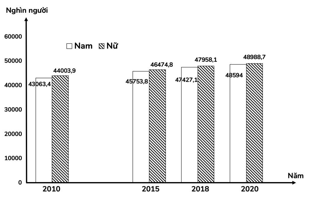 Cho biểu đồ sau: DÂN SỐ TRUNG BÌNH PHÂN THEO GIỚI TÍNH CỦA NƯỚC TA GIAI ĐOẠN 2010 – 2020 Dựa