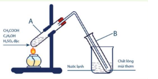 Cho 2mL C2H5OH, 2mL dung dịch CH3COOH đặc vào ống nghiệm A, lắc nhẹ, sau đó thêm tiếp khoảng 5 giọt dung dịch H2SO4 đặc và lắp dụng cụ như hình.