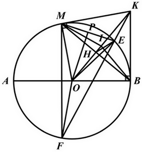 1) Cho đường tròn (O) có đường kính AB. Gọi M là một điểm thuộc đường tròn (M khác A và B). Tiếp tuyến đi qua M cắt tiếp tuyến đi qua B tại điểm K.