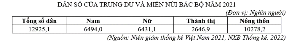 Tính tỉ lệ dân số nam của Trung du và miền núi Bắc Bộ năm 2021 (Làm tròn kết quả đến số thập phân thứ nhất của %).