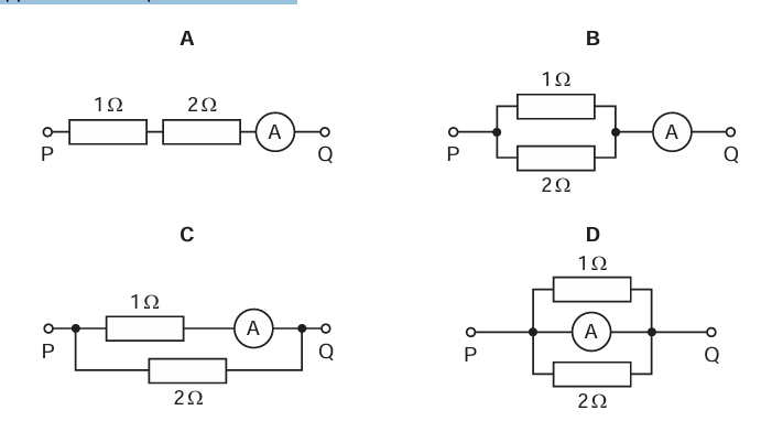 Trong mỗi mạch mắc điện trở, ampe kế có điện trở là \(2\,\,\Omega \). Mạch điện nào Ampe kế có số chỉ lớn nhất khi cùng một hiệu điện thế được đặt vào các điểm P và Q?