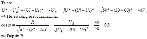 Mạch điện gồm có R,L,C mắc nối tiếp, cuộn dây L thuần cảm, hiệu điện thế hai đầu đoạn mạch u = 50√2 cos(100πt) (V). Hiệu điện thế hiệu dụng ở hai đầu cuộn cảm UL = 30 V; ở hai đầu tụ là UC = 60 V. Tìm hệ số công suất của mạch.