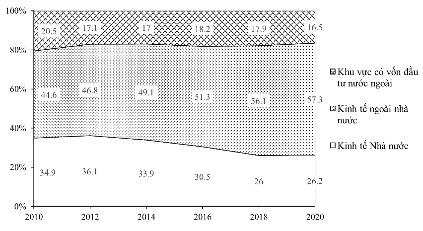 Biểu đồ trên thể hiện nội dung nào về vốn đầu tư phát triển toàn xã hội thực hiện phân theo thành phần kinh tế nước ta giai đoạn 2010 – 2020?