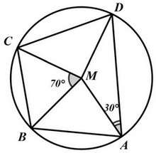 Cho tứ giác \(ABCD\) nội tiếp đường tròn tâm \(M\). Biết \(\angle {DAB} = {80^0}\), \(\angle {DAM} = {30^0}\) và \(\angle {BMC} = {70^0}\). Tính số đo các góc \(\angle {MAB},\angle {BCM}\) và \(\angle {BCD}\).