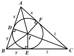 Cho tam giác \(ABC\), đường tròn tâm \(I\) bán kính \(r\) nội tiếp tam giác \(ABC\). Gọi \(D,E,F\) là các tiếp điểm \(\left( {D \in AB,E \in BC,F \in CA} \right)\). Đặt \(AB = c,BC = a,AC = b\), \(AD = x,BE = y,CF = z\)