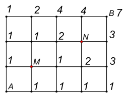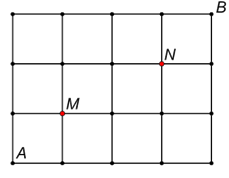 Chỉ được phép đi lên hoặc sang phải. Hỏi có bao nhiêu cách đi từ A đến B mà không đi qua M, N.