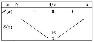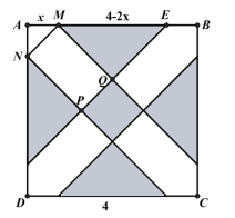 Đặt các điểm A, B, C, D, M, N, P, Q, E như hình vẽ. Đặt \(AM = x\left( {0 < x < 4} \right)\). Tính \({S_{\Delta MNE}}\) và diện tích hình vuông cạnh PQ. Từ đó lập phương trình diện tích phần tô màu theo x và khảo sát hàm số tìm GTNN.