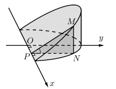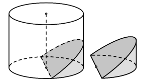 Từ một khúc gỗ hình trụ có đường kính 30 cm , người ta cắt khúc gỗ bởi một mặt phẳng đi qua đường kính đáy và nghiêng với đáy một góc \({45^\circ }\) để lấy một hình nêm (xem hình minh họa dưới đây)