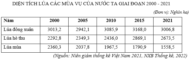 Phát biểu nào sau đây đúng về diện tích lúa các mùa vụ ở nước ta năm 2021 so với năm 2000?