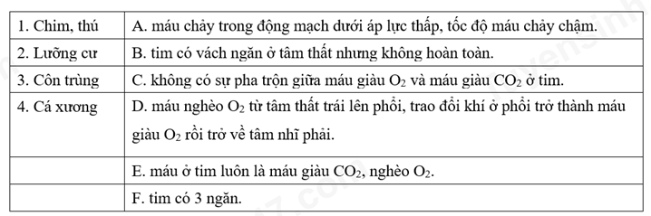 Ghép nội dung ở cột bên phải với nội dung ở cột bên trái để trở thành một câu có nội dung đúng về tuần hoàn máu ở động vật: